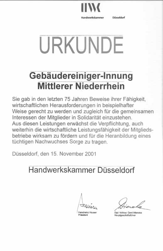 Am 15. November 1926 wurde bei Herrn Wendering in Krefeld Westwall 17, die freie Innung für das Glasreinigungsgewerbe gegründet. Die tagende Versammlung bestand aus 14 Glas- und Gebäude-Reinigungsunternehmen aus Krefeld und Umgebung. Die Gründung erfolgte einstimmig und wurde per eigenständiger Unterschrift attestiert: